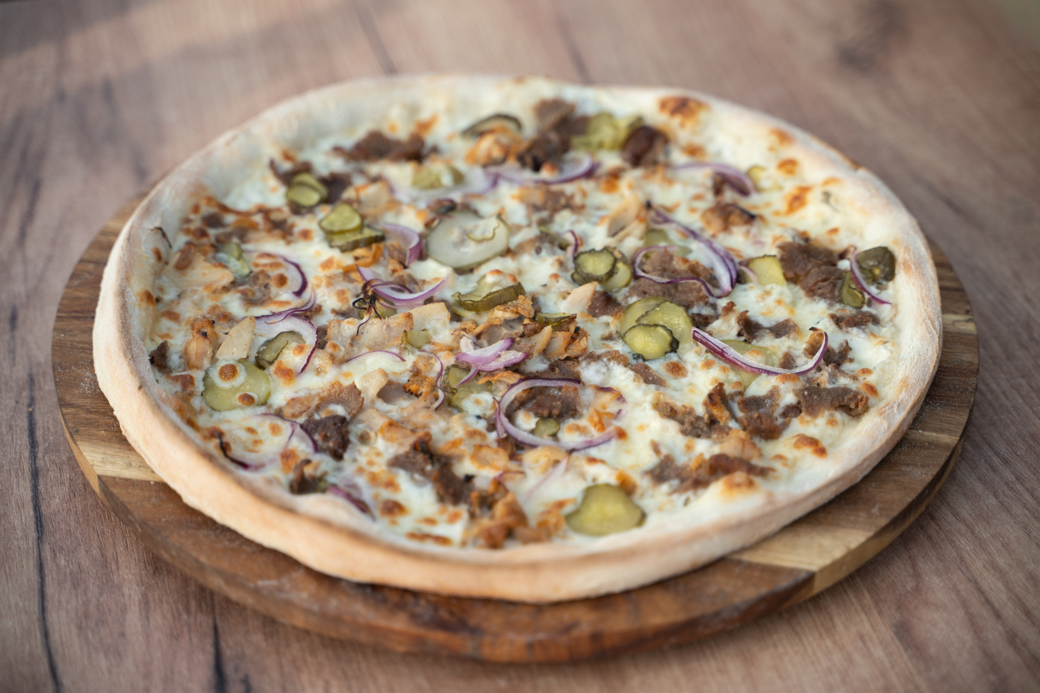 sos czosnkowy, ser mozarella, mięso wołowo-baranie oraz drobiowe, czerwona cebula, ogórek kiszony