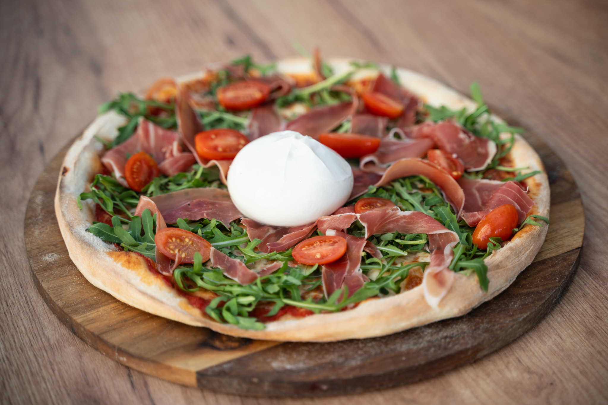 Sos pomidorowy, Burrata, rukola, szynka parmeńska, pomidorki koktajlowe