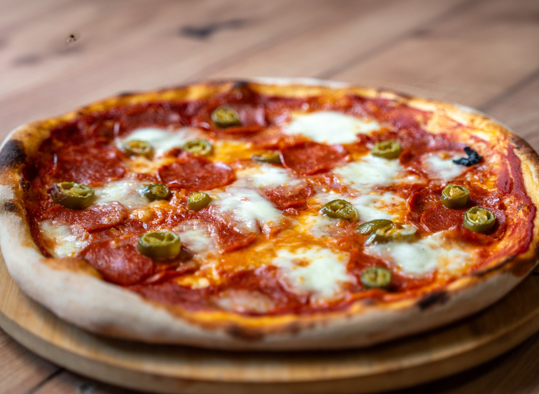 sos pomidorowy, salami spinata, salami, mozarella fior di latte, jalapeno, pepperoni