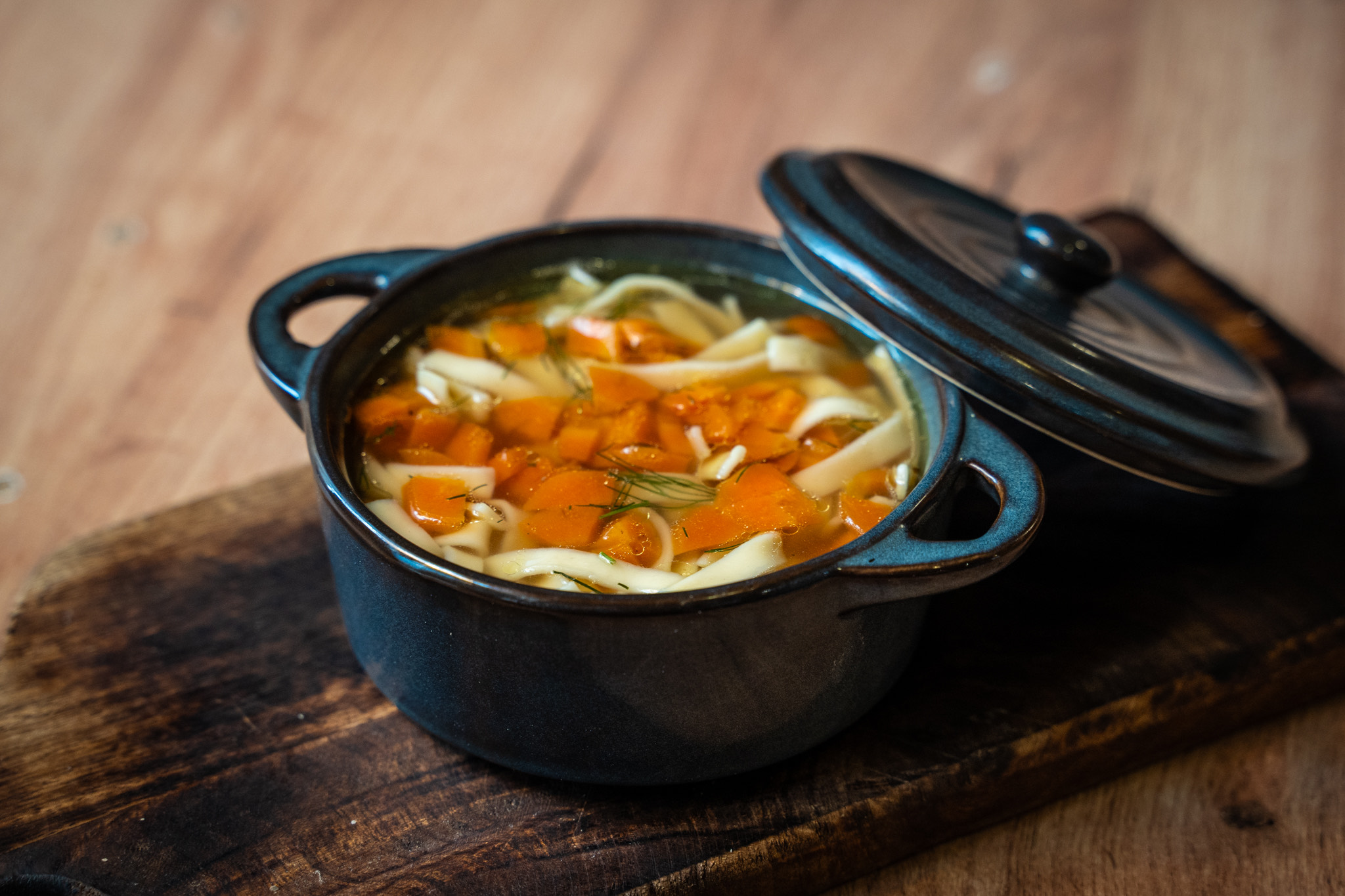 aksamitna zupa z pieczonej dyni, podawana z chrupiącą grzanką, kwaśną śmietaną i prażonymi pestkami dyni 300 ml
