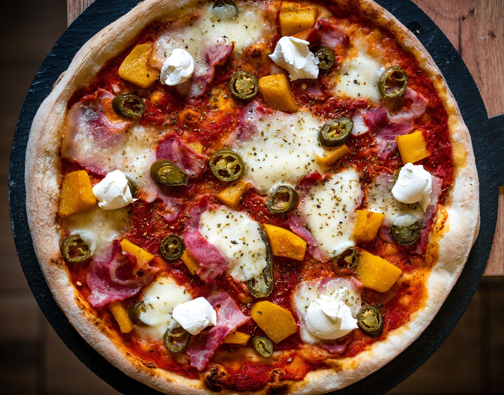 sos pomidorowy, dynia, bekon, czerwona cebula, jalapeno, mozarella fior di latte, mascarpone