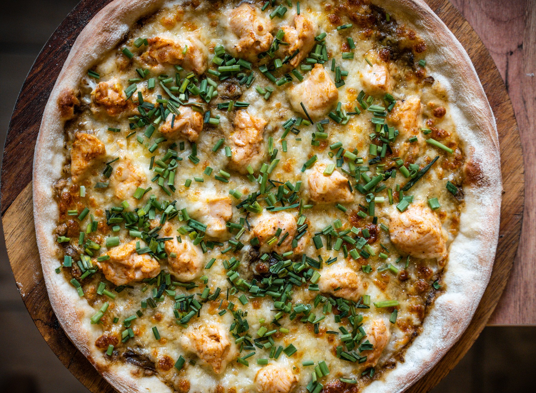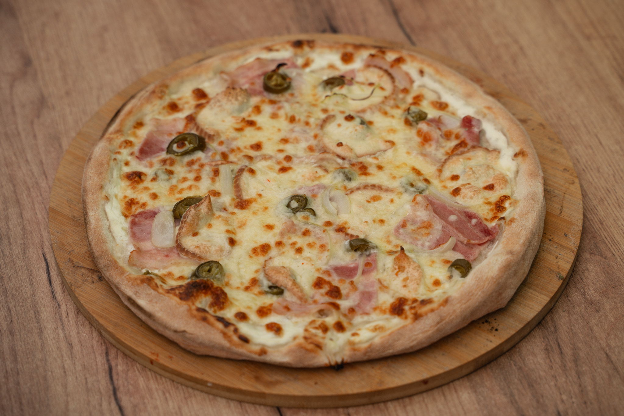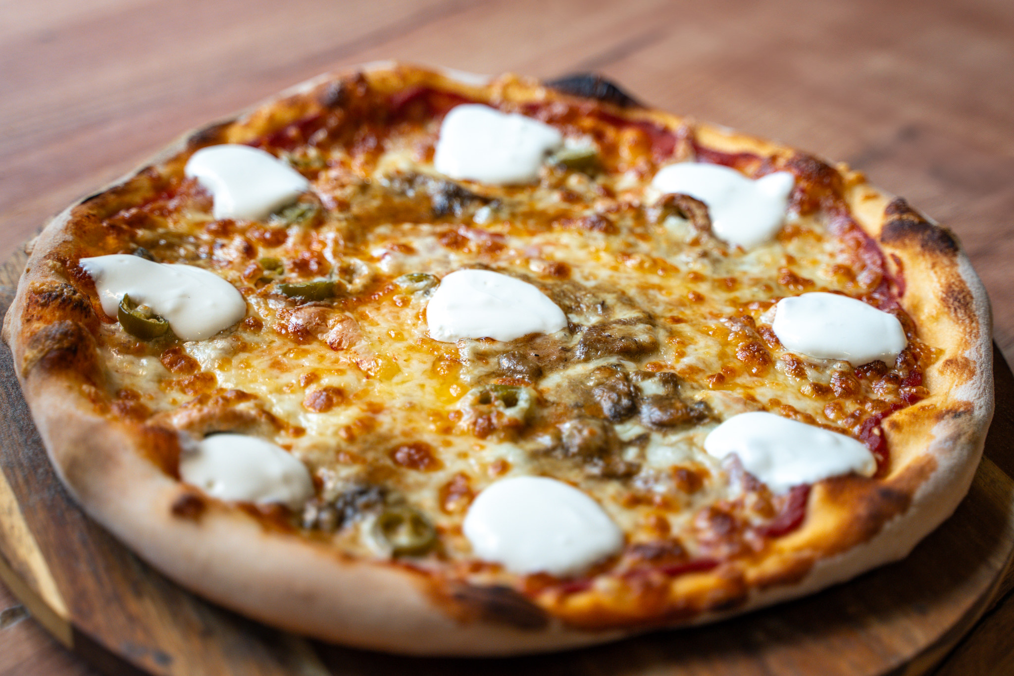 ser wędzony, jalapeno, grzyby leśne z cebulką, bekon, śmietana