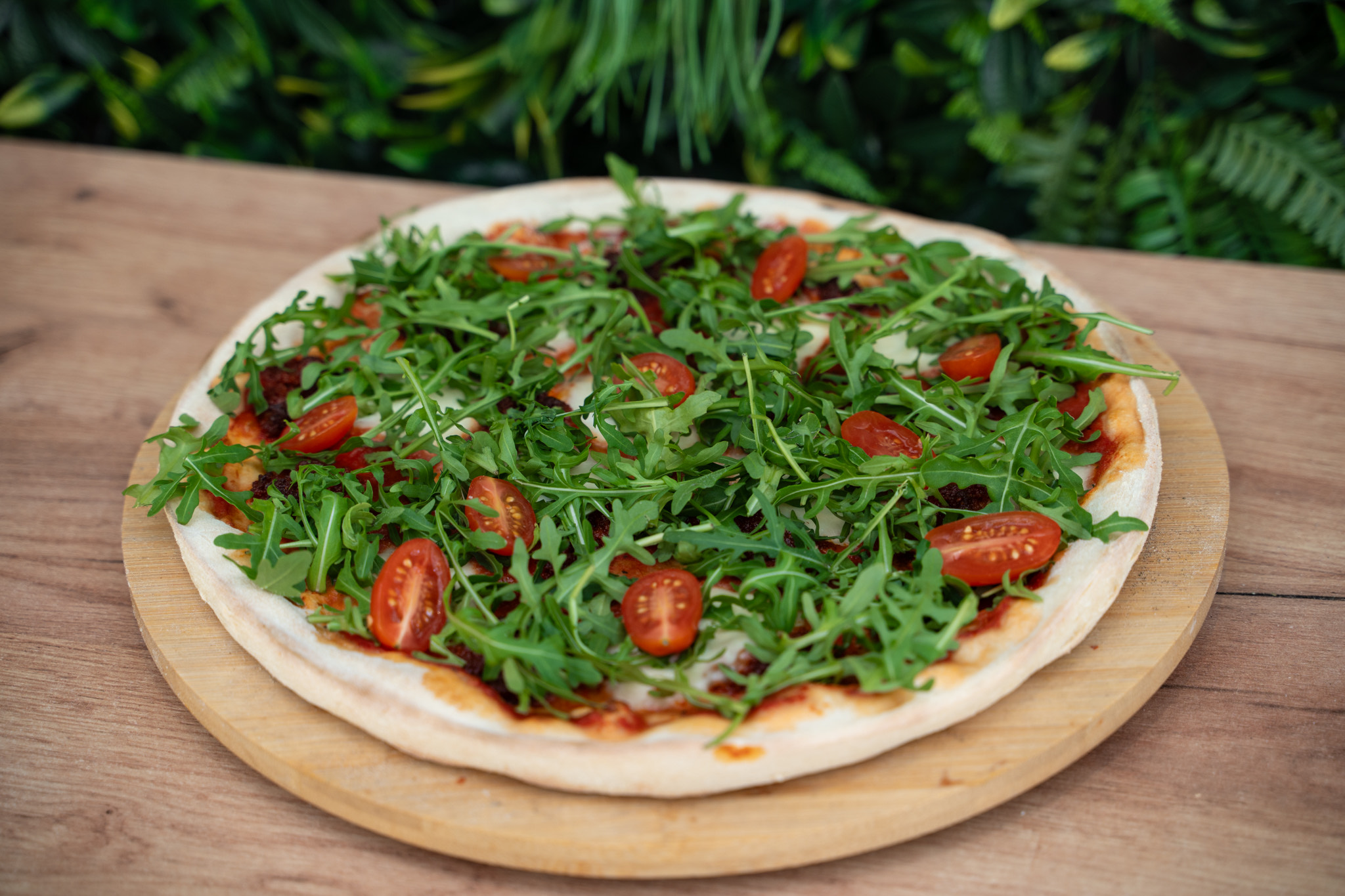 mozzarella fior di latte, pikantna kiełbasa nduja, rucola, pomidorki koktajlowe